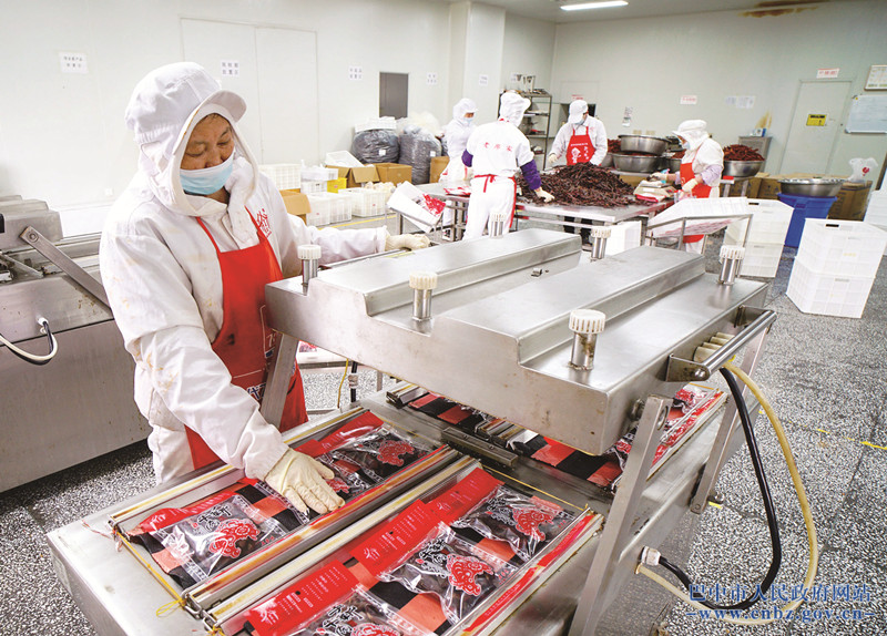 2月18日,四川老廖家风味食品有限公司工人正在生产手撕牛肉干系列商品。