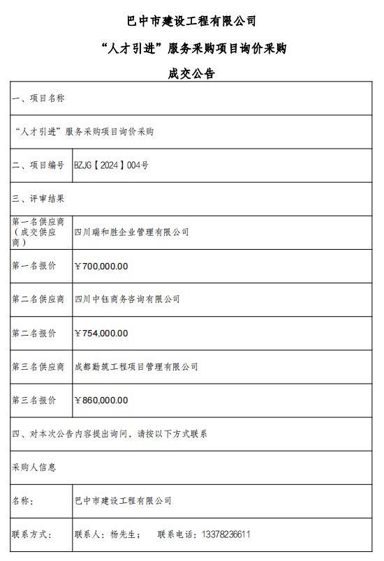 “人才引进”服务采购项目询价采购成交公告