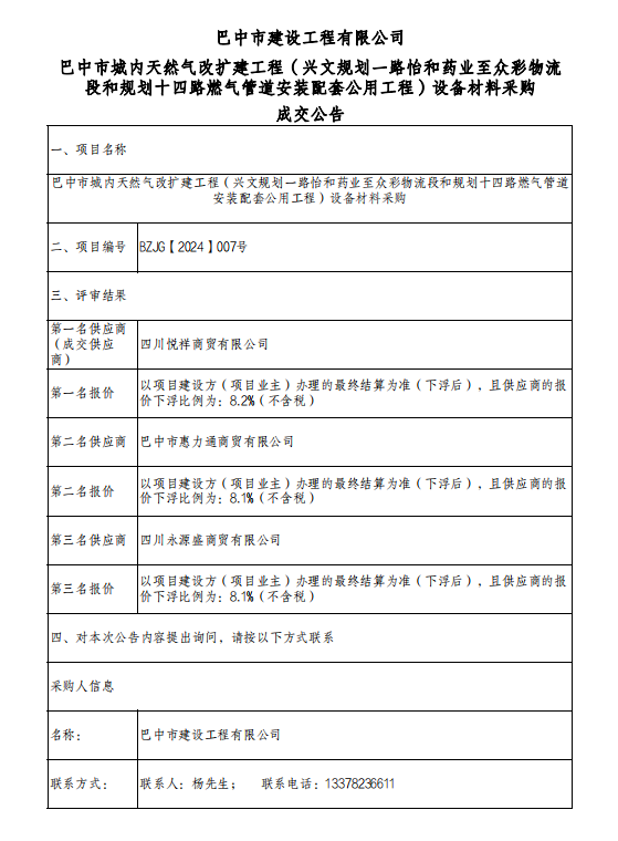 巴中市城内天然气改扩建工程(兴文规划一路怡和药业至众彩物流段和规划十四路燃气管道安装配套公用工程)设备材料采购成交公告