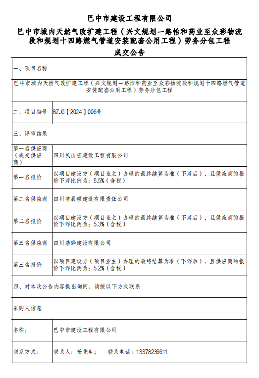 巴中市城内天然气改扩建工程(兴文规划一路怡和药业至众彩物流段和规划十四路燃气管道安装配套公用工程)劳务分包工程成交公告
