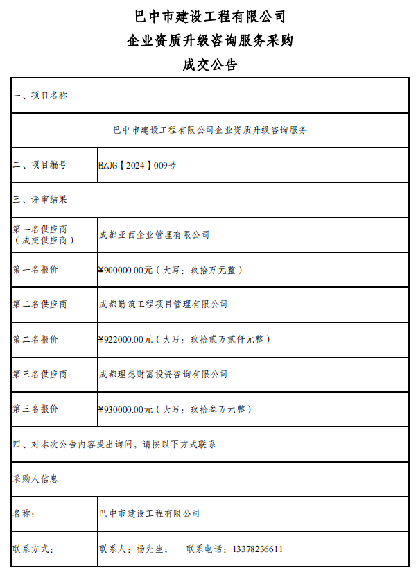企业资质升级咨询服务采购成交公告